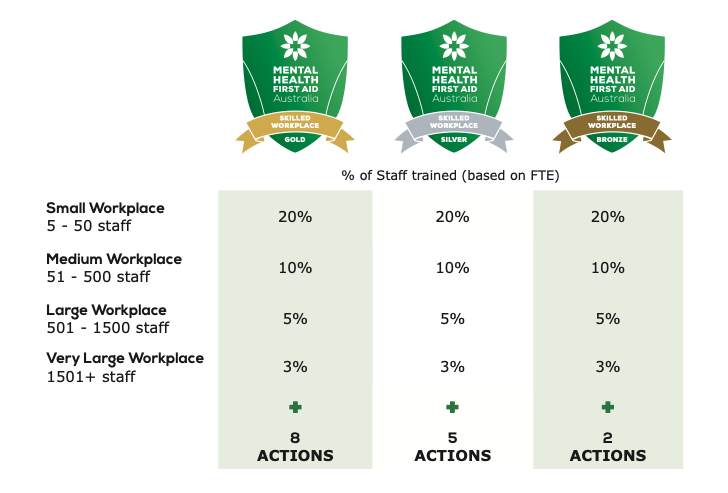 E.g. If you are a large workplace, applying for Gold level recognition, you will need to have: • 5% of your FTE workforce trained in Mental Health First Aid; and
